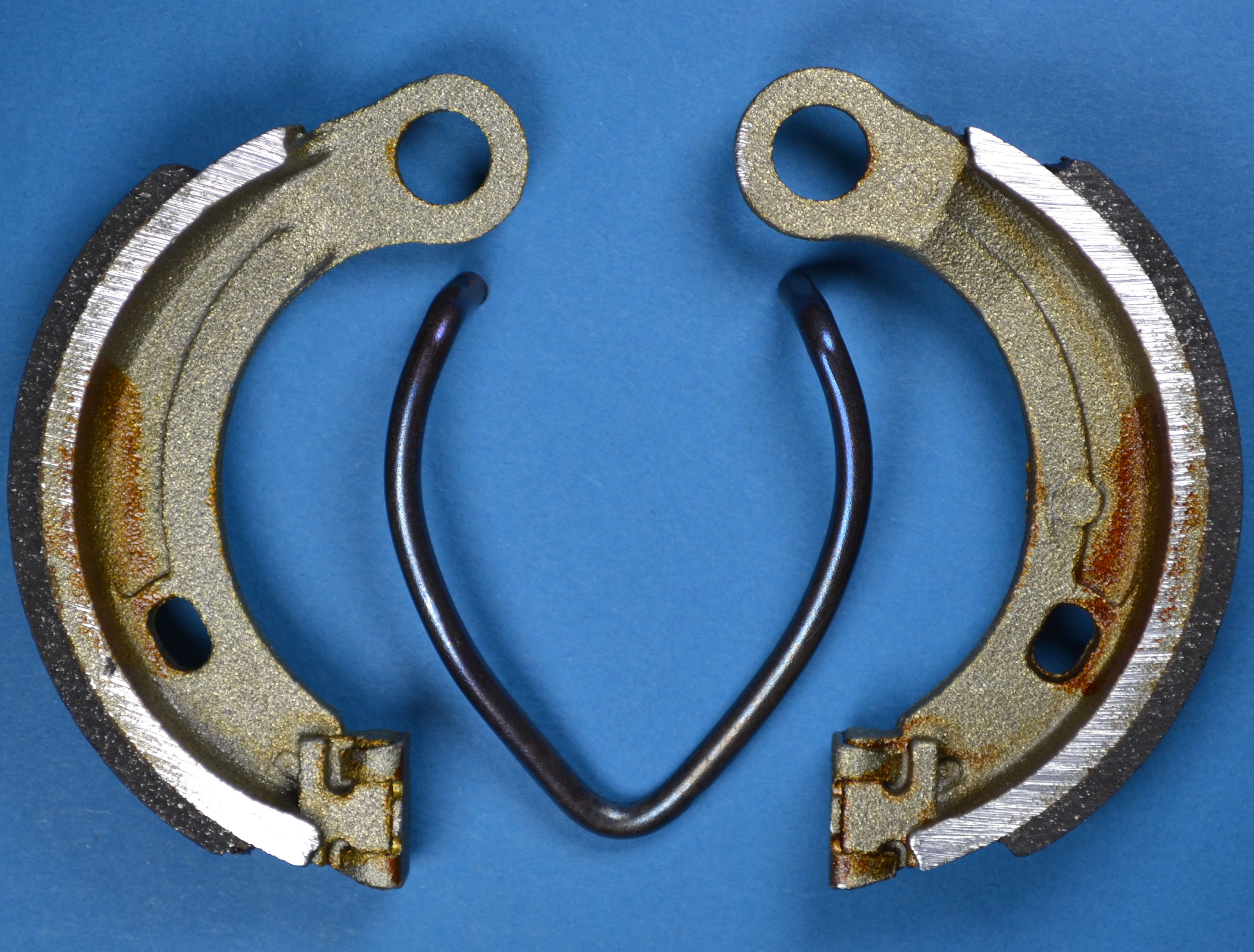 Neuer Bremsbacken-Satz inkl. Bremsfeder, der z.B. in die Alufelgen / Gussräder der Modelle Hercules/DKW/SACHS Prima 2, 3, 4, 5, 5S, 6, M4, M5, MX, Optima 3, 50 verbaut werden kann.