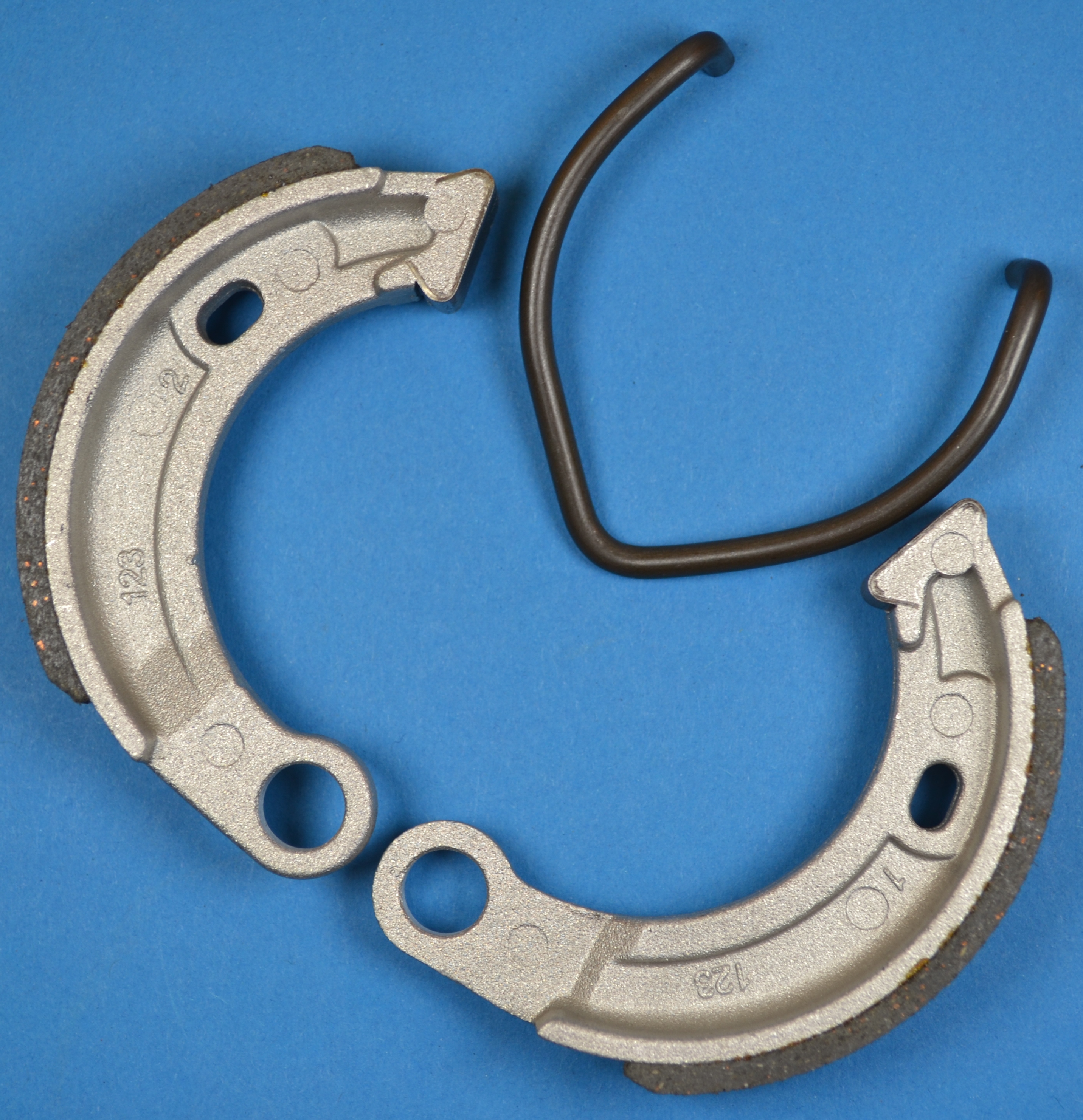Neuer Bremsbacken-Satz inkl. Bremsfeder, der z.B. in die Alufelgen / Gussräder der Modelle Hercules/DKW/SACHS Prima 2, 3, 4, 5, 5S, 6, M4, M5, MX, Optima 3, 50 verbaut werden kann.
