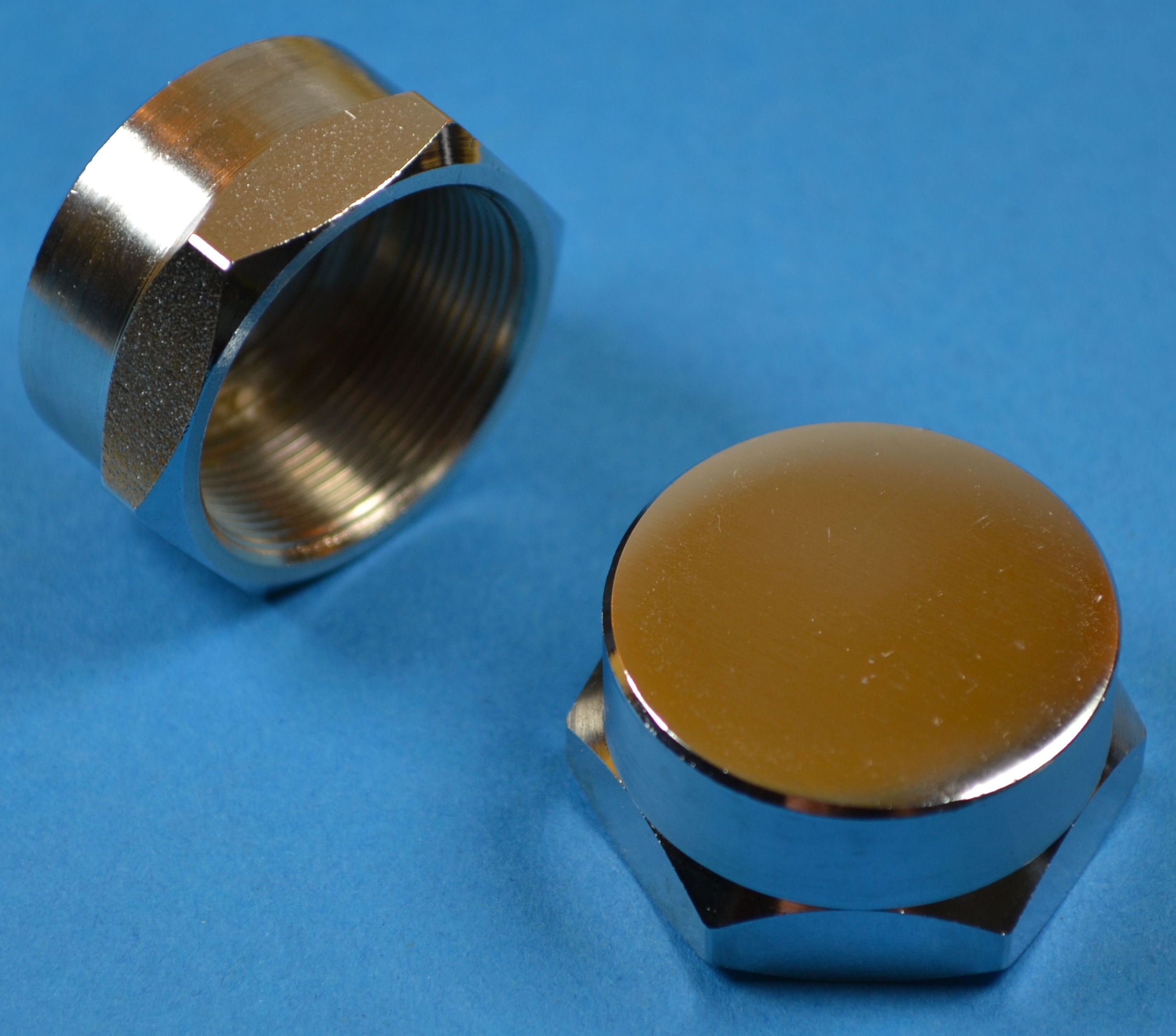 Diese Abschlussmutter hat eine äußere Schlüsselweite von ca. 30 mm. Die Höhe des Gewindes beträgt ca. 10 mm und die Höhe insgesamt ca. 15,9 mm. Damit ist die Mutter etwas höher als das damalige Original.