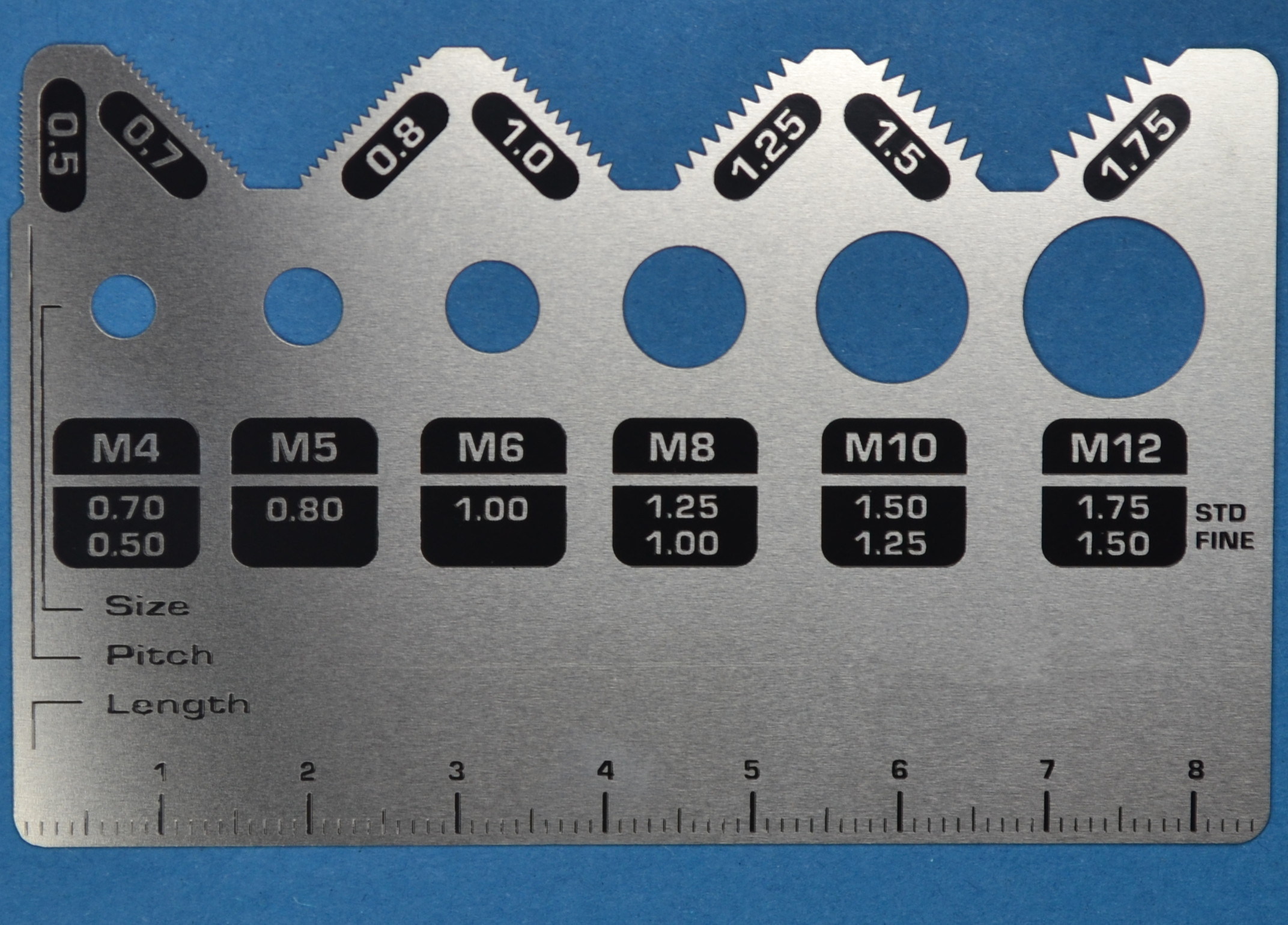 Neue Messschablone für Schrauben. Diese erlaubt die Bestimmung von M4, M5, M6, M8, M10 und M12 Schrauben sowie die dazugehörigen Steigungen mit 0,5 | 0,7 | 0,8 | 1,0 | 1,25 | 1,5 | 1,75. Dazu ist noch eine Skala mit einer Länge von 85 mm vorhanden.